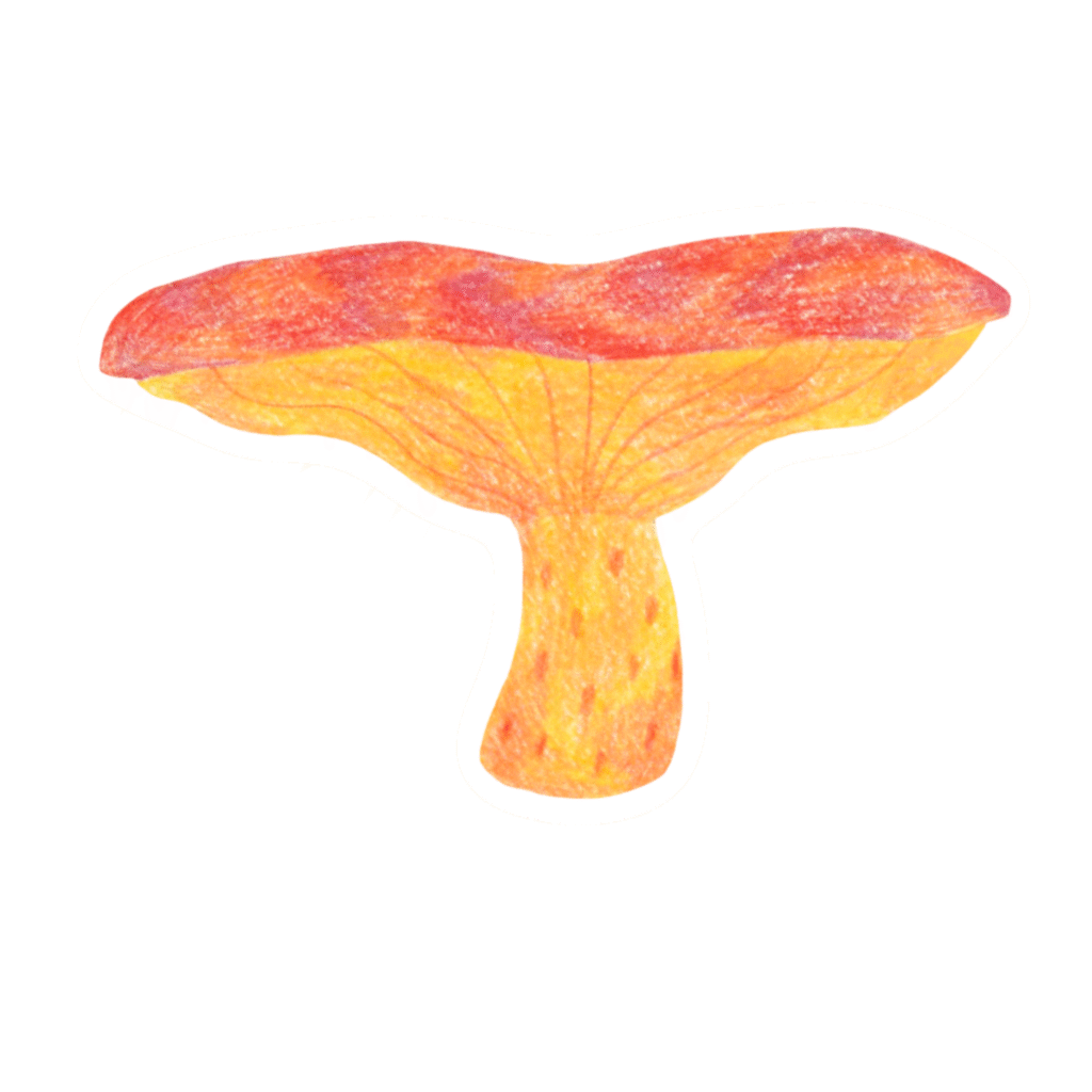 Cette illustration me ramène tout droit dans la forêt des Cévennes, parmi les pins et les buissons. En quête d’un délicieux repas, mes amigos et moi-même nous sommes penchés sur tous les champignons que l’on pouvait trouver. Pas si fastoche de déterminer si un champignon peut finir dans notre gosier sans risque… À grand renfort de bouquins de mycologie et d’applications numériques, nous avons fait notre pioche hasardeuse. Histoire de ne pas s’empoisonner, nous sommes allés toquer chez Reine, la doyenne du village.
